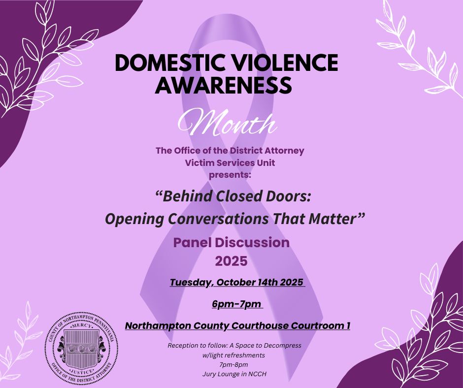 Description: The Office of the District Attorney Victim Services Unit presents this panel discussion in honor of Domestic Violence Awareness Month. A space to decompress with light refreshments will be available to follow from 7-8pm in the Jury Lounge.