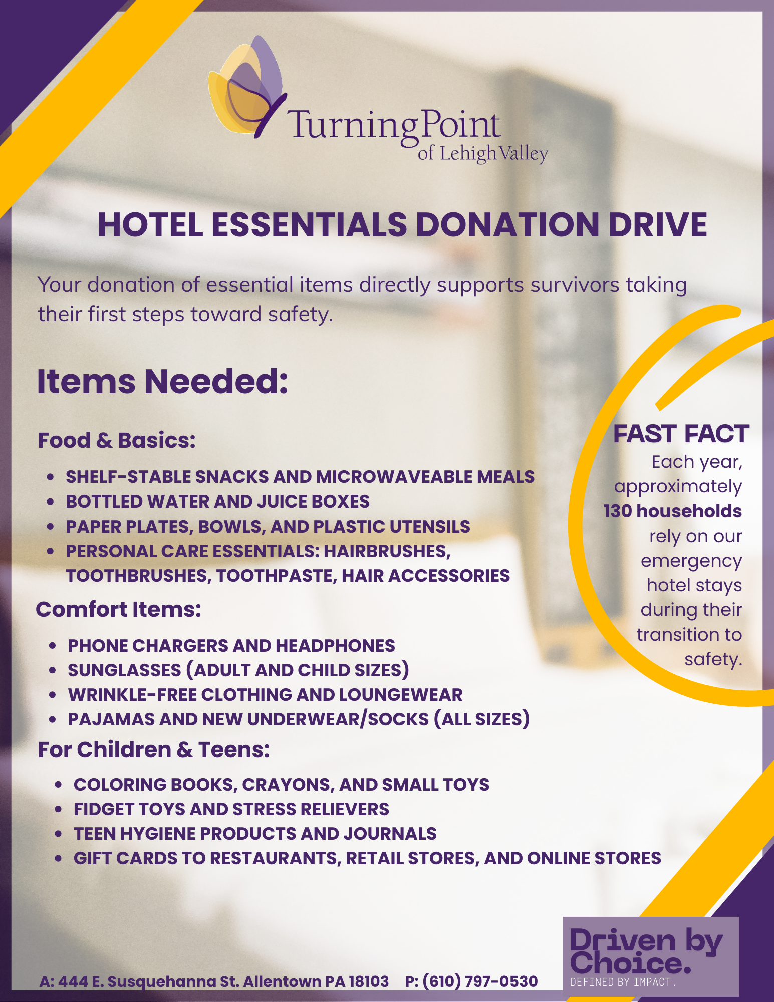 Join us as we collect hotel essentials for survivors taking their first steps toward safety. Your donation of snacks, toiletries, comfort items, or gift cards helps provide comfort and support during their transition.