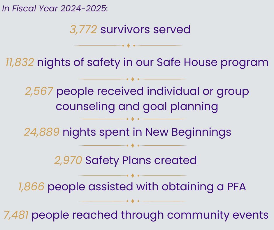 Fiscal year 2024-2025 has ended and we are taking a moment to reflect on the impact we made in the Lehigh Valley this year. From our advocates who work in the Lehigh and Northampton County Courthouses, to our New Beginnings transitional housing program, to our outreach and education events, Turning Point reached over 11,000 Lehigh Valley residents this year.