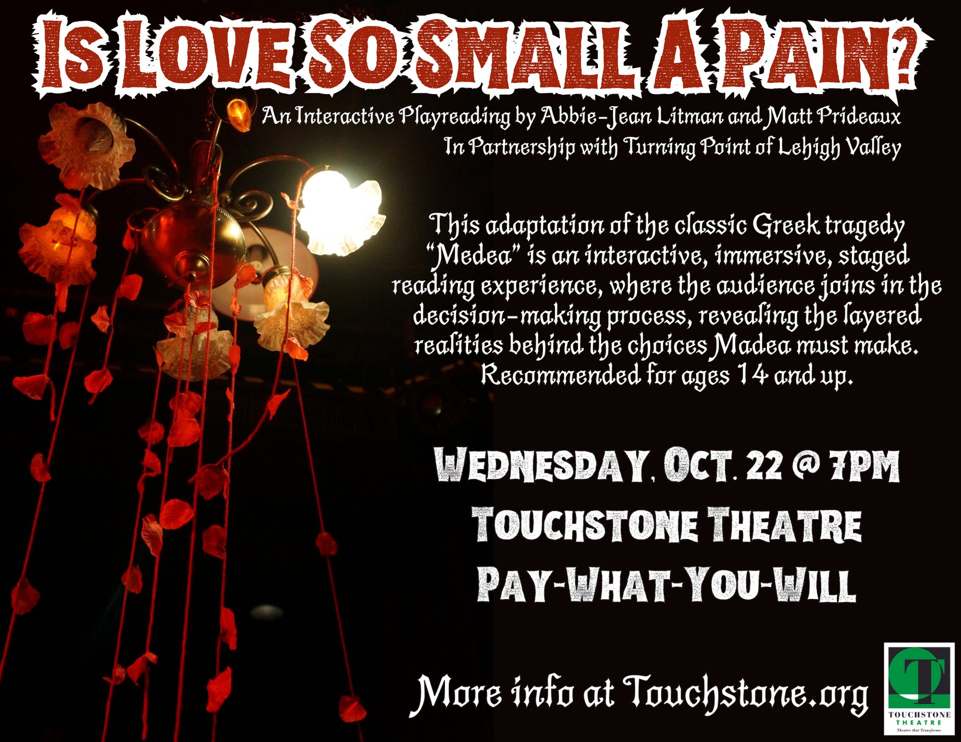 In recognition of Domestic Violence Awareness Month, Turning Point of Lehigh Valley is partnering with Touchstone Theatre to present an interactive staged reading of “Is Love So Small a Pain?”, a powerful adaptation of the classic Greek tragedy Medea.