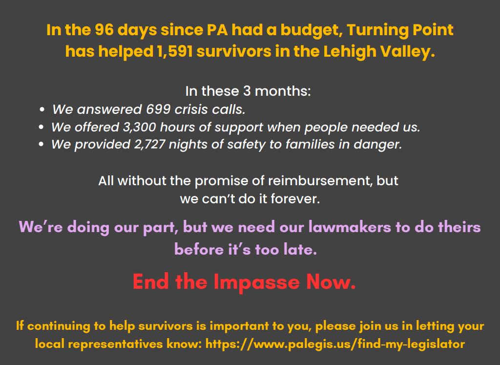 A significant portion of the funds we need to do our work with survivors is being held up as part of the state's budget impasse. We need our legislators to understand that real people are being impacted by the delay in passing the budget. |