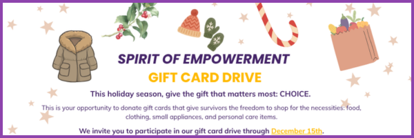 Our annual Spirit of Empowerment Gift Card Drive replaces traditional holiday in-kind collections such as toys and clothes with gift cards to empower survivors to choose what works best for them and their family. This holiday season, give the gift of choice. |